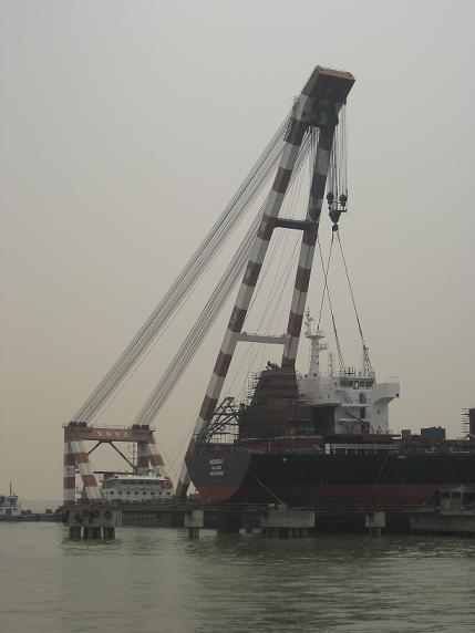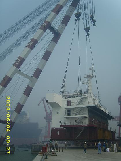 2009年6月4日、5日兩天,57000噸散貨輪(船體號(hào)HT003、HT012)上建吊裝在韓通重工圓滿完成。本次吊裝利用穩(wěn)強(qiáng)3號(hào)浮吊進(jìn)行上建整體吊裝。高層領(lǐng)導(dǎo)對此次工藝改進(jìn)高度重視,全程現(xiàn)場跟蹤指導(dǎo)。