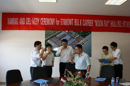2009年9月4日,中午13:00,我司為希臘船東建造的第三艘57000噸散貨輪(船體號:HT003)在韓通重工6#會議室成功交付。該船由SUMEC代理,入BV船級社。Mirage Finance Inc.駐廠經(jīng)理Panayotis Yannoutsos,SUMEC總經(jīng)理田鳴,江蘇韓通船舶重工有限公司董事長孟成君先生、總經(jīng)理武亦文先生,副總經(jīng)理陳興以及各位嘉賓代表出席了該儀式。整個交船儀式沉浸在喜欣的氣氛之中,儀式最后大家舉杯歡慶、合影留念。