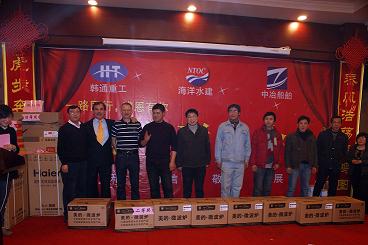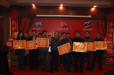 2010年2月8日晚,北辰大酒店宴會大廳燈火璀璨,流光溢彩,由韓通重工、海洋水建、中冶船舶、文景大酒店共同舉辦的,以“一路同行,感恩有你”為主題的迎春聯(lián)歡晚會正在舉行。歡快的音樂縈繞在耳畔,滿場的紅色襯托出喜慶的氣氛,讓整個會場籠罩在歡騰之中。晚會首先由孟董事長及四家公司高層領(lǐng)導(dǎo)進行了新春賀詞,接著備受矚目的優(yōu)秀員工、優(yōu)秀大學生、優(yōu)秀班組、優(yōu)秀施工單位和優(yōu)秀施工班組獎項在晚會上相繼頒出,此時在各工作崗位上辛勤工作了一年的同事們成了彩光燈下最耀眼的明星。晚會中現(xiàn)場抽獎讓晚會氣氛再次高漲,而特等獎液晶彩電的抽取更是將晚會的氣氛推向了最高點。大家歡欣鼓舞,熱情高漲,都沉浸在歡樂之中。