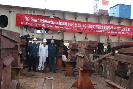 我司為德國(guó)船東建造的57000噸散貨輪(船體號(hào):HT043)于2010年11月23日上午10:00在我司1號(hào)船臺(tái)舉行了上臺(tái)儀式,該船入LR船級(jí)社,計(jì)劃2011年4月30日交船。陳林軍常務(wù)副總及船東船檢代表參加了該儀式。