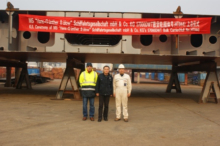 我司為德國船東建造的57000噸散貨輪(船體號:HT044)于2010年12月21日下午14:00在我司1號船臺舉行了上臺儀式,該船入LR船級社,計劃于2011年7月31日交船。陳林軍常務(wù)副總及船東船檢代表參加了該儀式。
