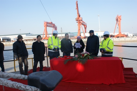 2011年1月25日下午,我司為PeterDoehle建造的57000噸散貨輪(船體號(hào):HT024)在文景國(guó)際大酒店會(huì)議室舉行了命名及交船儀式。該船被命名為"TASMAN CASTLE",入LR船級(jí)社。常務(wù)副總陳林軍,船東代表Babic,中航技的代表洪昊舟參加了該儀式。2011年1月26日,三方共同簽署了交船協(xié)議。至此,該船成功交付。