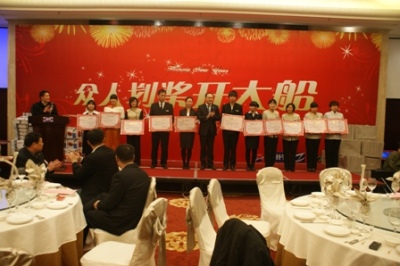 團(tuán)拜會(huì)現(xiàn)場(chǎng)分為兩個(gè)部分——表彰大會(huì)和迎春晚宴。表彰大會(huì)由陳興副總主持,分別由陳林軍常務(wù)副總等公司高層為2010年度韓通優(yōu)秀員工,韓通優(yōu)秀班組,海洋優(yōu)秀個(gè)人與班組,中冶優(yōu)秀個(gè)人與班組,文景優(yōu)秀個(gè)人,韓通優(yōu)秀外包施工班組以及韓通優(yōu)秀勞務(wù)公司頒獎(jiǎng),此時(shí)在各工作崗位上辛勤工作了一年的同事們成了彩光燈下最耀眼的明星。