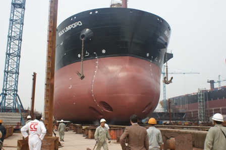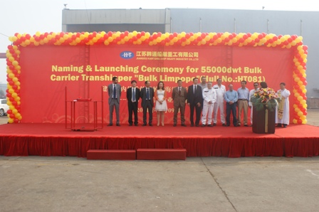 我司為意大利船東COECLERICI集團建造的55000噸自卸散貨船(船體號HT081)于2011年6月9日在我司3#船臺舉行命名及下水儀式,該船入意大利船級社,被命名為“BULK LIMPOPO”,代理公司為蘇美達貿(mào)易公司。HT081為該項目系列船中的第2條。陳林軍常務(wù)副總,陳興副總,船東代表及船級社代表參加該儀式。