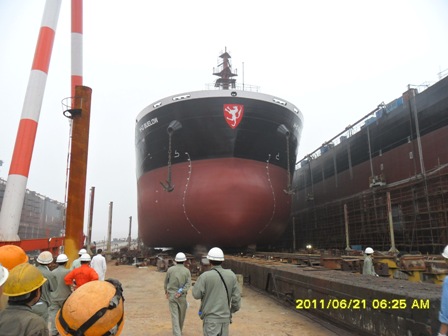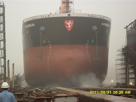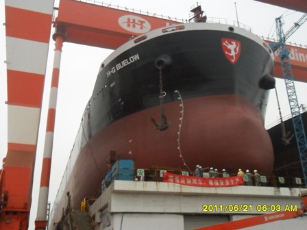 2011年6月21日, 我司為 Peter Dolhe 建造的57000DWT散貨輪(HT044)在韓通2號船臺成功下水,該船入LR船級社。陳林軍常務副總,李繼念副總,船東代表及船級社代表參加該儀式。