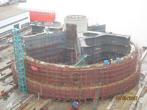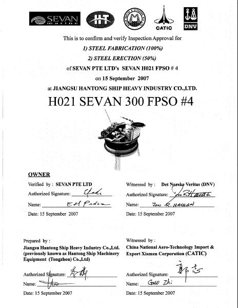 二零零七年九月十五日是韓通重工的雙喜日,船廠迎來(lái)了同一天完成Sevan300 FPSO(H021)兩個(gè)節(jié)點(diǎn)的目標(biāo):