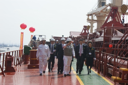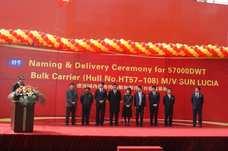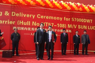 2012年3月20日江蘇韓通船舶重工有限公司迎來了又一個值得慶祝和紀念的日子—HT57-108命名及交船儀式。該57000DWT散貨輪為我司為HHI船東建造并交付的第一條散貨輪,該船被命名為“SUN LUCIA”, 入KR船級社。韓通重工董事長孟成君、船東、船檢及代理公司代表參加了該儀式并發(fā)表講話。儀式結束后,船東船檢代表等參觀了該船,并給予很高的評價。
