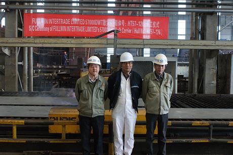 2013年3月15日,我司為大連新凱船東建造的57000噸散貨輪(船體號(hào):HT57-126)開工儀式在韓通新船體車間順利舉行,該船入NK船級(jí)社。王繼林總經(jīng)理助理、經(jīng)營部蔡世海部長及船東、船檢代表參加該儀式。