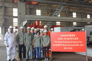 2014年10月6日,我司為挪威船東LIGHTHOUSE建造的64000噸散貨輪(船體號:HT64-161)開工儀式在韓通新船體車間順利舉行,該船入DNV.GL船級社。周義慶副總經理及船東、船檢代表參加該儀式。