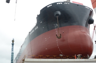 2014年11月24日,我司為大新船東建造的64000噸散貨輪(HT64-210)在韓通3號船臺成功下水,該船入BV船級社。韓通經(jīng)營部部長蔡世海,大新董事長張?zhí)m水、副總張佰世、副總王春生及船級社代表參加該儀式。
