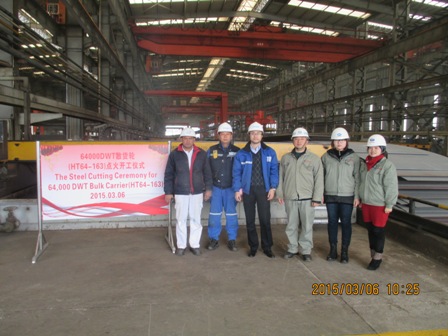 2015年3月6日,我司為挪威船東LIGHTHOUSE建造的64000噸散貨輪(船體號(hào):HT64-163)開(kāi)工儀式在韓通新船體車間順利舉行,該船入DNV▪GL船級(jí)社。朱亮總經(jīng)理助理及船東、船檢代表參加該儀式。