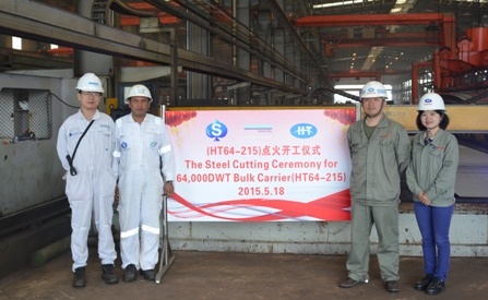 2015年5月18日,我司為挪威船東SPAR建造的64000噸散貨輪(船體號:HT64-215)開工儀式順利舉行,該船入DNV▪GL船級社。朱亮總經(jīng)理助理及船東、船檢代表參加該儀式。