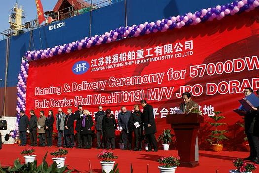 - 2009年12月16日的天氣寒冷刺骨,韓通碼頭傳來的陣陣禮炮聲和歡呼聲,我司為德國PD船東建造的第四艘57000噸散貨輪(HT019)在此隆重舉行了命名及交船儀式,現(xiàn)場洋溢著一片溫暖和喜慶的氣息。德國船東代表Jan Oltmann、圣母Mrs.Martina Schaefer、英國勞氏船級社代表Alan Swinbank、代理公司弘業(yè)集團(tuán)代表季轟和韓通重工代表武亦文分別在儀式上致辭。儀式結(jié)束后,各位貴賓在武亦文總經(jīng)理的陪同下登船參觀了這艘散貨輪,并在船上合影留念。