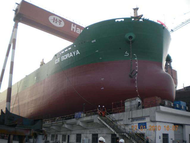 我司為巴哈馬船東Soraya Shipping Company Limited建造的57000噸散貨輪(船體號HT064)于2010年1月17日下午4:50在我司1號船臺順利下水,該船是我為巴哈馬船東建造的第一艘57000噸散貨輪,其建造十分順利,僅用了70天的船臺周期。武亦文總經(jīng)理,格雷格駐廠項(xiàng)目經(jīng)理Martin Adams,英勞駐廠代表參加了該儀式。