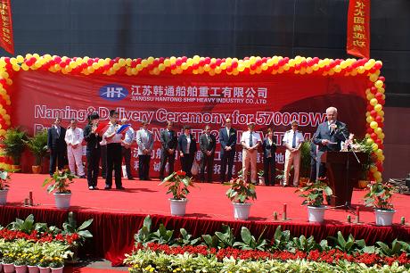 該船為SPLOSNA PLOVBA公司建造。包括船東代表Egon Bandelj先生,圣母Loredana Kolbe夫人,Werner先生以及江蘇弘業(yè)股份有限公司船舶部總經(jīng)理季轟先生,韓通重工執(zhí)行副總陳林軍先生在內(nèi)諸多貴賓共同見證了這個(gè)激動(dòng)人心的時(shí)刻,并做了精彩演講。